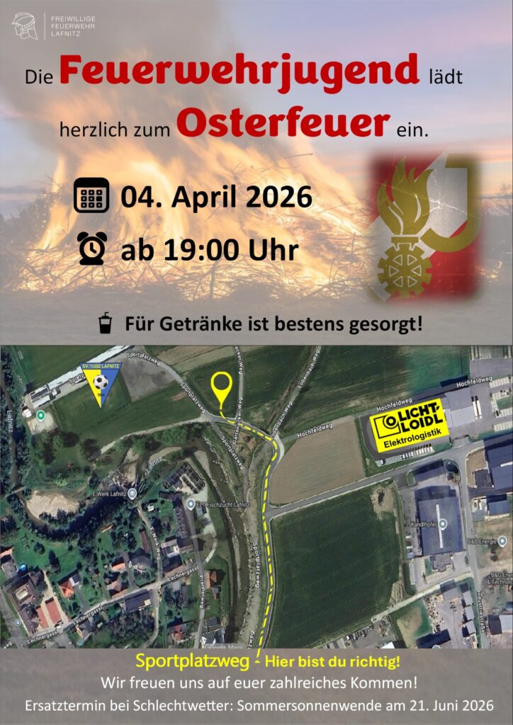 Am Samstag, dem 04.04.2026 veranstaltet die Feuerwehrjugend ein Osterfeuer in Lafnitz beim Sportplatz. Beginn: 19 Uhr. Achtung die Veranstaltung findet bei Schlechtwetter nicht statt.