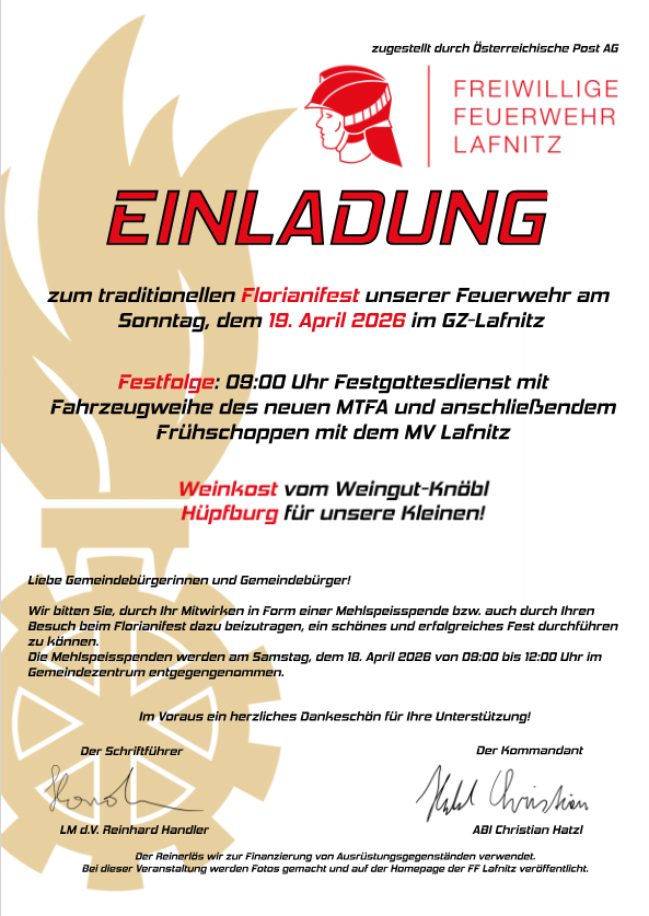 Am Sonntag, dem 19.04 findet das traditionelle Florianifest im GZL statt. Der Festgottesdienst beginnt um 09:00 Uhr mit Fahrzeugsegnung. Anschließend Frühschoppen mit musikalischer Gestaltung durch den Musikverein Lafnitz. Für Speis und Trank, sowie für unsere kleinen Gäste, ist gesorgt. Wir freuen uns auf zahlreiche Besucherinnen und Besucher. |