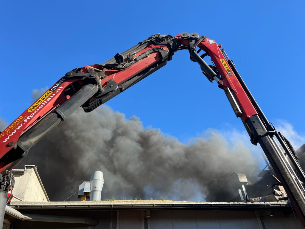 Zur Unterstützung beim Öffnen der Gebäudehülle wurde die Feuerwehr Pöllau mit dem schweren Rüstfahrzeug angefordert. Mit Hilfe des schweren Rüstfahrzeuges wurden Gebäudeteile entfernt und dahinterliegende Brände durch die bereitstehenden Atemschutztrupps gelöscht.